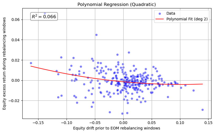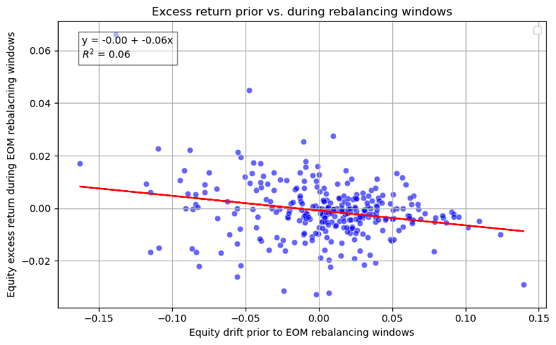 The results, shown in the chart below, suggest a statistically significant inverse relationship: when equities outperform fixed income earlier in the month, creating upward drift, returns during the rebalancing window tend to be lower, and vice versa. This inverse relationship is statistically strong but explains only a modest portion of the variance.