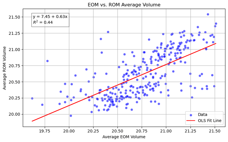 Trading Volume (EOM) = β₀ + β₁ × Trading Volume (ROM) + ε