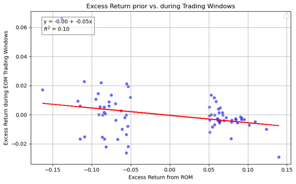 We then run a regression using equity drift prior to the EOM rebalancing window as the independent variable, and the excess return of equities during or immediately after the rebalancing window as the dependent variable.