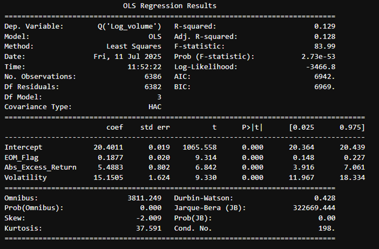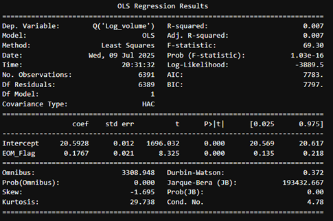 We introduced a binary indicator variable—set to 1 if the data point corresponds to an EOM day, and 0 otherwise. We then ran a simple regression model:
