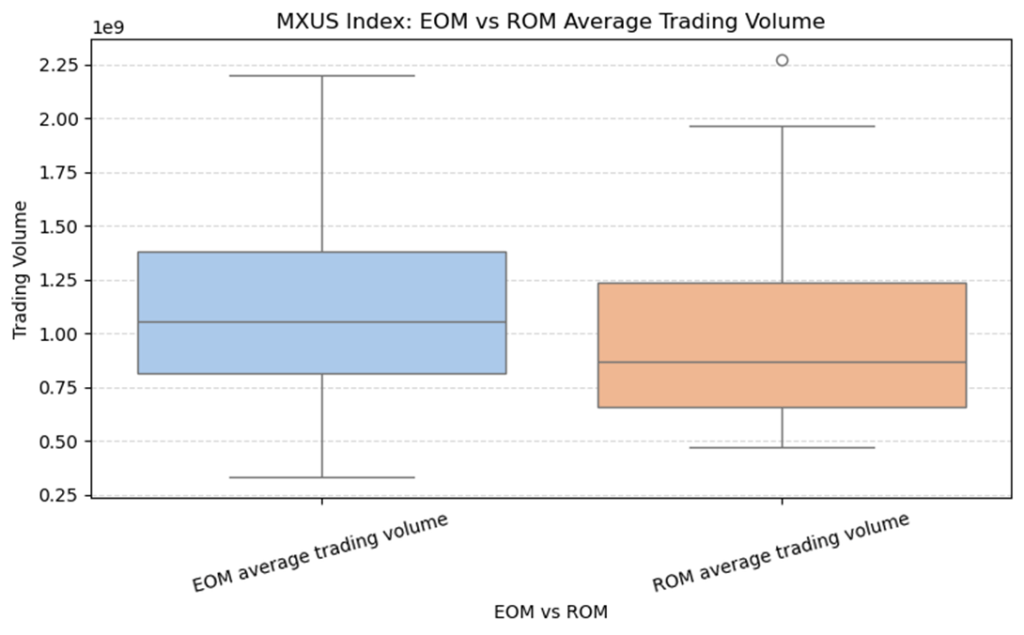 As shown in Exhibit 1, the boxplot visually confirms that average trading volume on EOM days is noticeably higher than the average volume during ROM days.